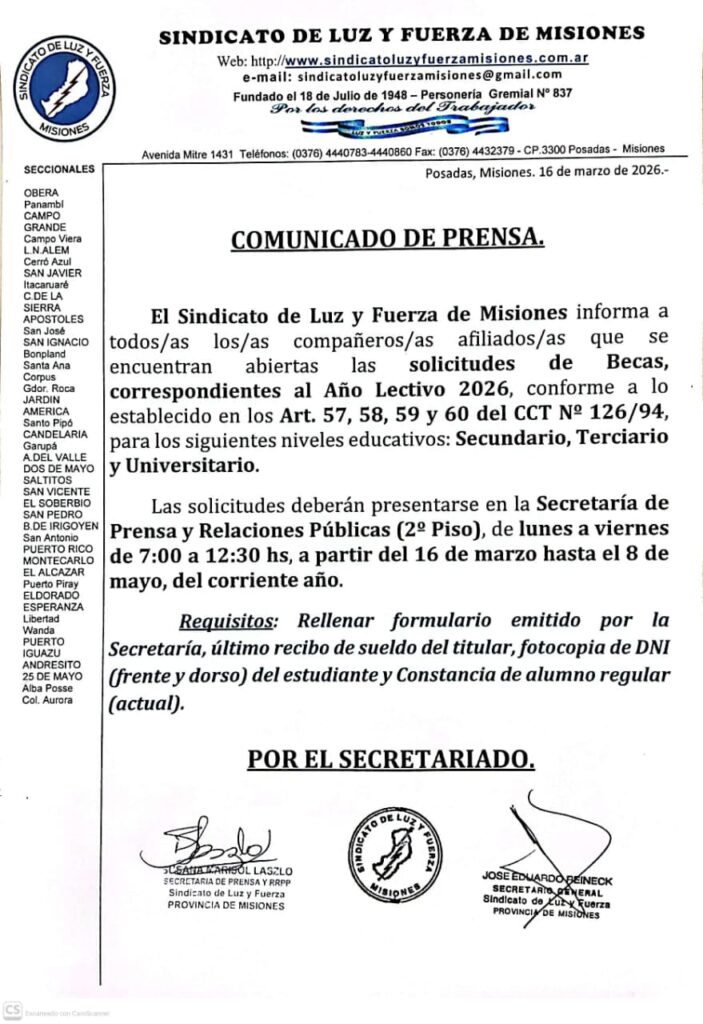 l Sindicato de Luz y Fuerza de Misiones informa a los/as compañeros/as afiliados/as que se encuentran abiertas las solicitudes de Becas para el Año Lectivo 2026, destinadas a hijos, estudiantes de nivel Secundario, Terciario y Universitario.